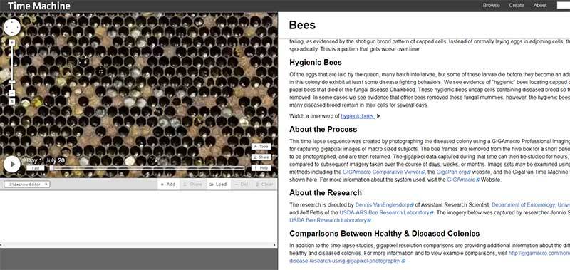 Using a specially designed GIGAmacro rig, we are capturing time-lapse gigapixel images to better understand the progression of honey bee ‘brood’ diseases. The resulting images, taken from both healthy and diseased combs, will not only elucidate the etiology of disease development, but also serve as an invaluable aid to beekeepers seeking to diagnose disease in their colonies. These images will potentially revolutionize extension efforts aimed at helping beekeepers preserve the life of their bees. For more information on this and other efforts of the team included on this project, click here.